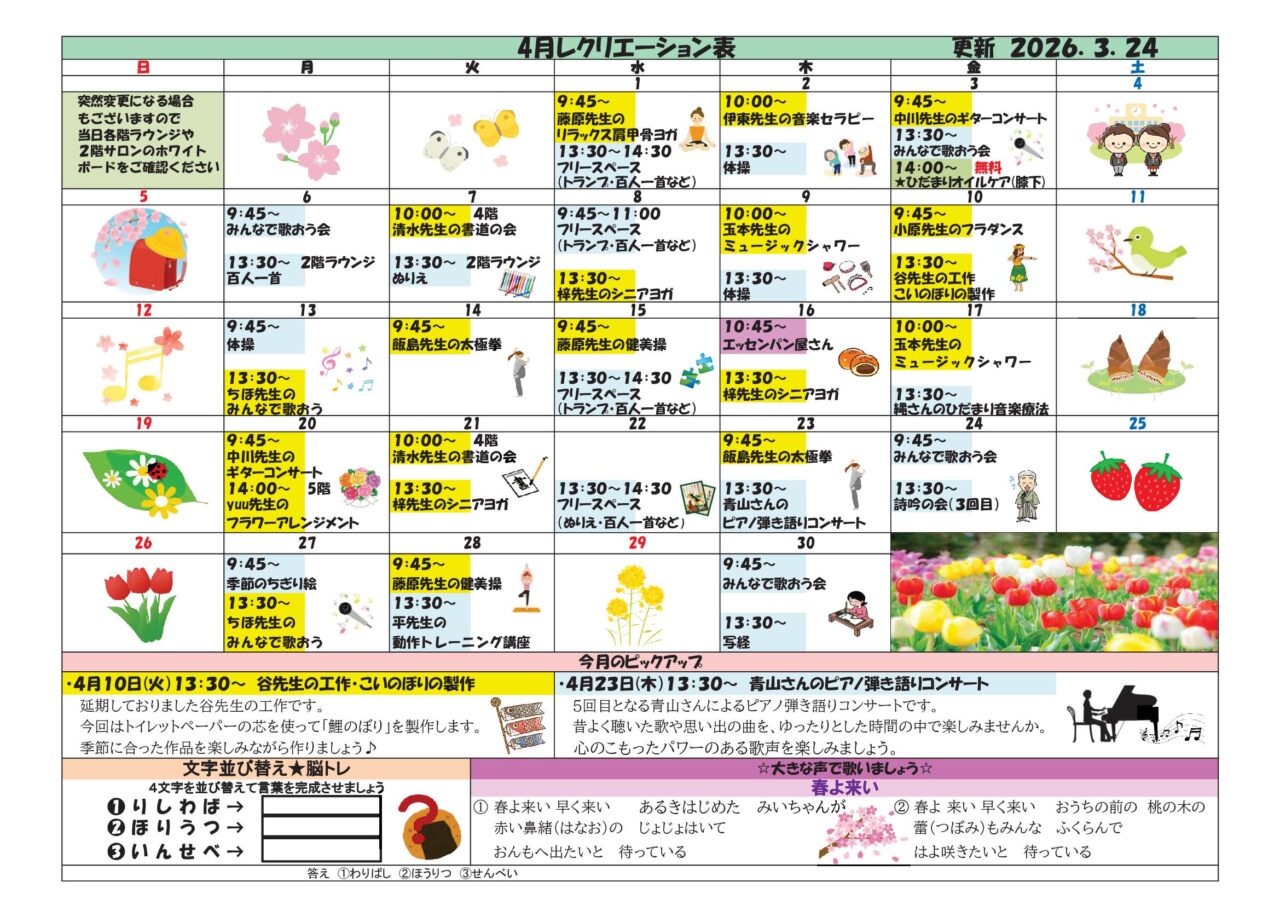 4月のレクリエーション 2026.04.01 レクリエーション 画像をクリックすると拡大してご覧いただけます。 今月は…4/3(金)ひだまりオイルケア(膝下)が開催されます。また、4/16(木)にはエッセンパン屋さんがやってきます!