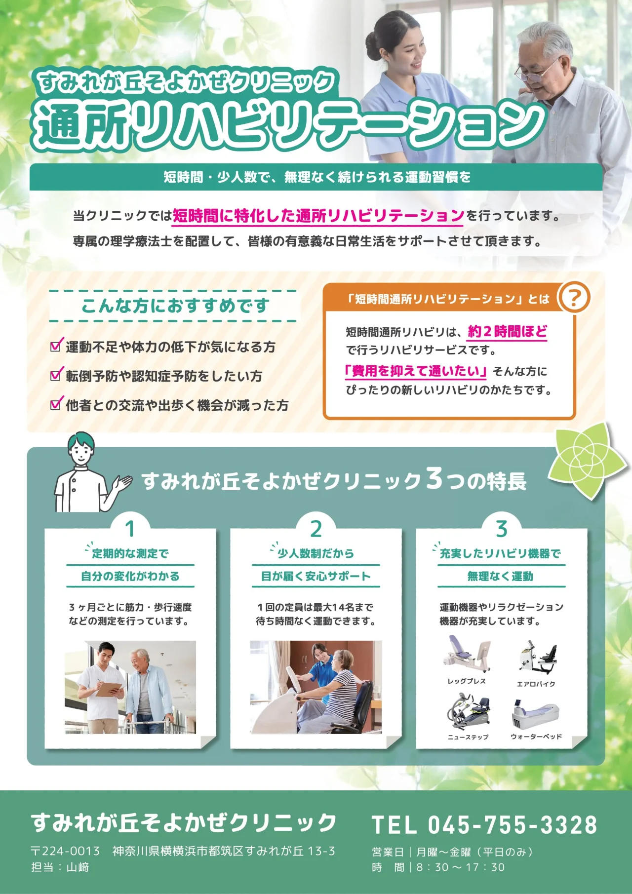夢別邸1階には2つのクリニックが併設していますので、緊急時でも安心です。また、健康で活動的な生活が送れることを目的にした短時間特化型「通所リハビリテーション」も併設しております。充実したリハビリ機器と専属の理学療法士を配置して、皆さまの有意義な日常生活をサポートしています。