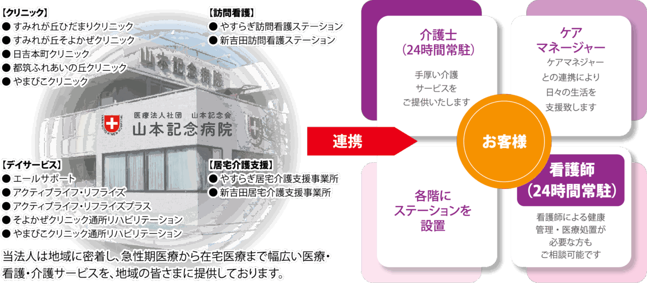 地域医療に定評がある山本記念会が運営する「夢別邸すみれが丘」。医師、看護師、介護士、ケアマネージャーとの連携により日々の生活をサポートしております。往診時には隣接する調剤薬局の薬剤師も同行していますのも特徴の一つです。また緊急時には、救急病院への迅速な対応や退院後のフォローも山本記念病院にて行うことが可能です。当施設から送迎も行います。